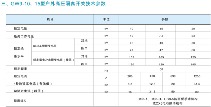 GW9-10/15型隔離開關(guān)按防污等級來分有2種:GW9-10和GW9-10W按電流分:有200A 400A 630A 800A 1000A 1250A、按電壓分:有10KV 15KV。