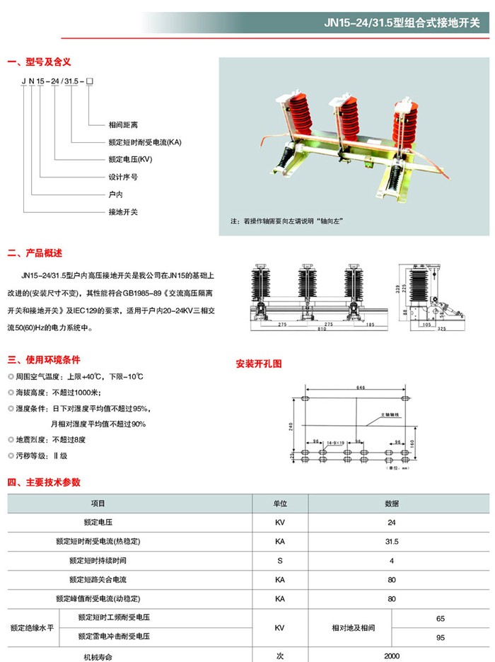 JN15-24系列高壓接地開關是集國內外接地開關最新技術而開發的一種具有先進水平的產品。經全面考核,其性能符合GB1985-89《交流高壓隔離開關和接地開關》及IEC129的要求,可與各種型號高壓開關柜配套使用,作為接地保護用。 JN15-24型戶內高壓接地開關(以下簡稱接地開關)是我公司根據市場需要設計開發的新型接地開關,適用于戶內3~12KV三相交流50(60)Hz的電力系統內和各型號高壓開關柜配套使用,亦可作為高壓電器設備檢修時接地用。