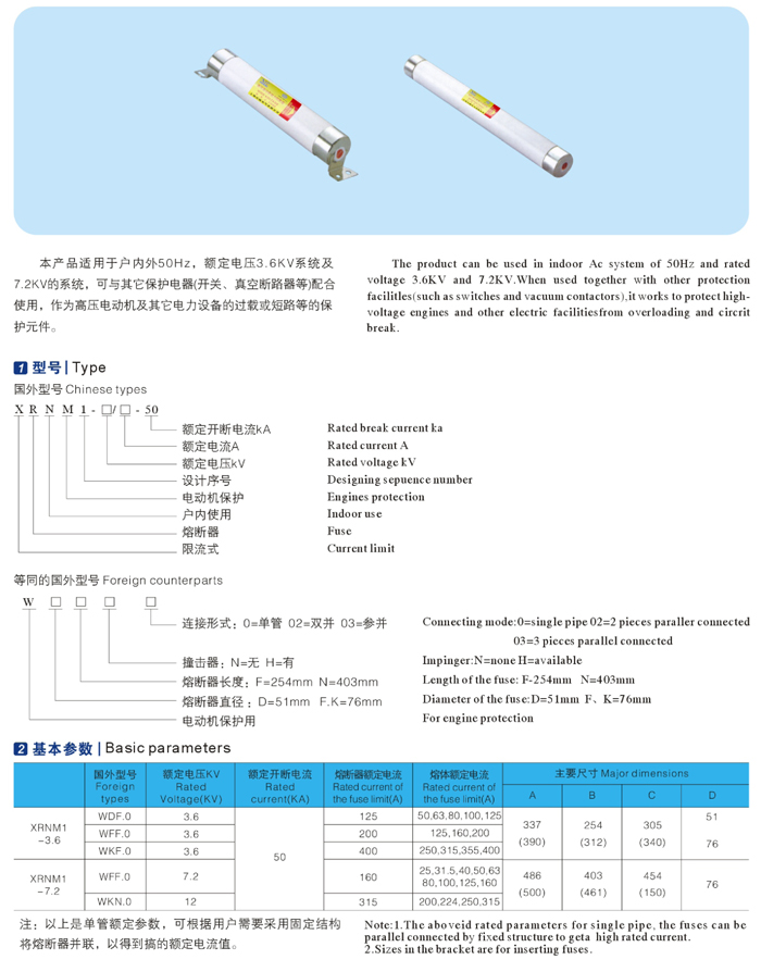 本產(chǎn)品適用于戶內(nèi)外50Hz,額定電壓3.6KV系統(tǒng)及7.2KV的系統(tǒng),可與其它保護(hù)電器(開關(guān)、真空斷路器等)配合使用,作為高壓電動機(jī)及其它電力設(shè)備的過載或短路等的保護(hù)元件。(通過了國家高壓電器質(zhì)量監(jiān)督檢測中心型式試驗,產(chǎn)品符合GB15166.2和IEC282-1)。